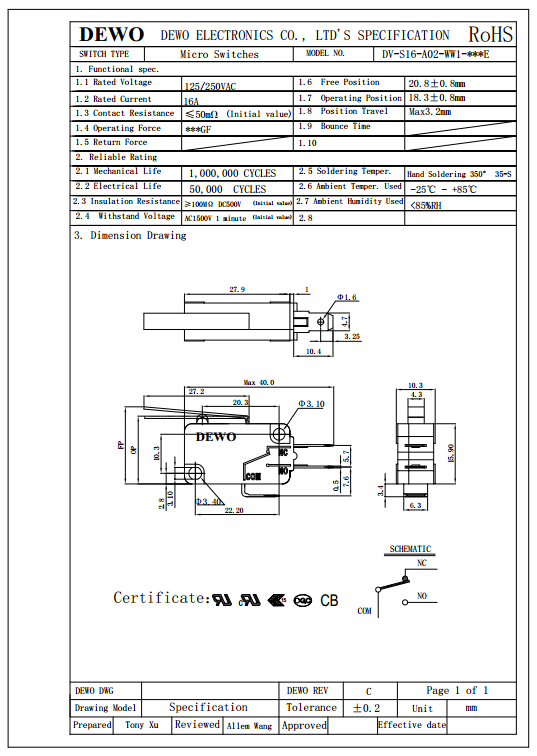 DV-16-A02-WW1-100E型微動開關(guān)